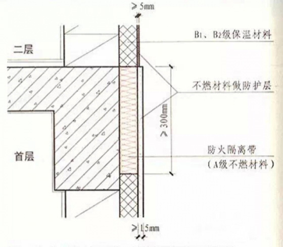 5.在保溫系統(tǒng)中每層應(yīng)設(shè)置高度不小于300毫米且燃燒性能為A級(jí)的水平防火隔離帶。防護(hù)層厚度首層不應(yīng)小于15毫米,其它層不應(yīng)小于5毫米。