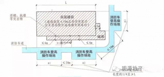 3)對(duì)于建筑高度大于50米的建筑,操作場(chǎng)地的長(zhǎng)度和寬度分別不應(yīng)小于20米和10米,其他高層建筑,操作場(chǎng)地的長(zhǎng)度和寬度分別不應(yīng)小于15米和10米。