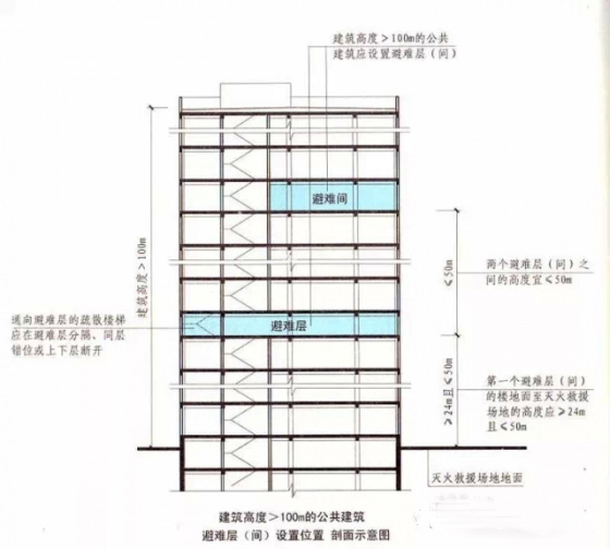 2.完善了公共建筑避難層的防火要求,如,第一個(gè)避難層(間)的樓地面至滅火救援場(chǎng)地地面的高度不應(yīng)大于50米,兩個(gè)避難層(間)之間的高度不宜大于50米;